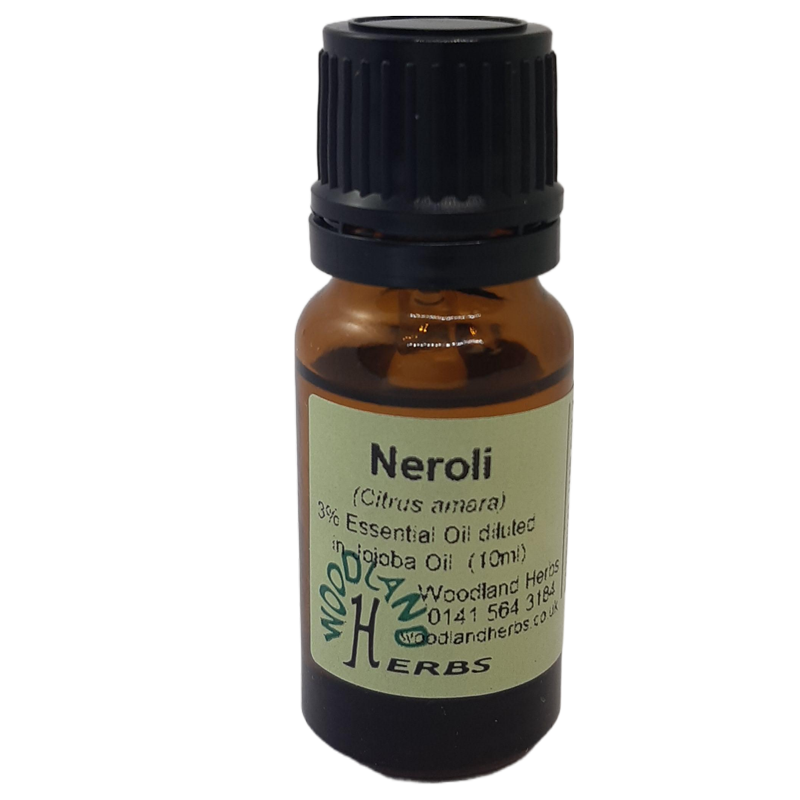 Neroli (Citrus auranthium) essential oil (3%) diluted in Jojoba Oil in a brown amber bottle with an integral dropper.